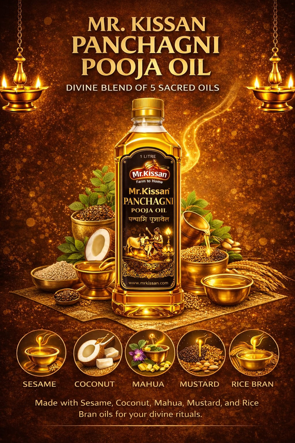 · Made withMr Kissan Panchagni Pooja Oil is a premium devotional oil specially crafted for spiritual rituals, daily prayers, and temple use. Made from a sacred blend of five pure vegetable oils, this traditional formula symbolizes purity, positivity, and divine energy. The oil is carefully infused with a devotional fragrance, creating a calm and spiritual atmosphere during pooja, meditation, and religious ceremonies.